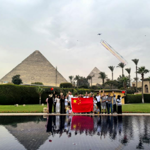 当地时间28日中午,中国空军1架运-20与空军八一飞行表演队6架歼-10表演机编队飞越金字塔上空,歼-10表演机在空中拉出象征中埃两国国旗颜色的6道彩烟,吉萨金字塔景区内的观众争相合影留念。