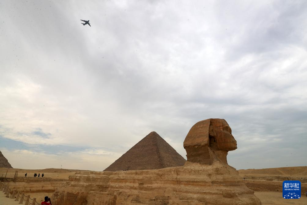8月28日,在埃及吉萨金字塔景区,中国空军运-20飞越金字塔景区上空。新华社记者 隋先凯 摄