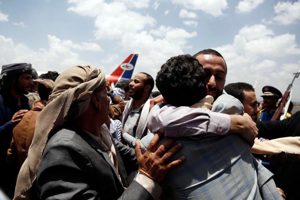 2023年4月14日,在也门萨那机场,获释胡塞武装成员战俘下飞机后与家人拥抱。也门政府与胡塞武装当天开始大规模换俘行动。新华社发(穆罕默德·穆罕默德摄)