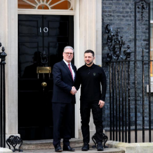 2025年3月1日,在英国伦敦唐宁街10号首相府前,英国首相斯塔默(左)与乌克兰总统泽连斯基握手。新华社记者李颖摄