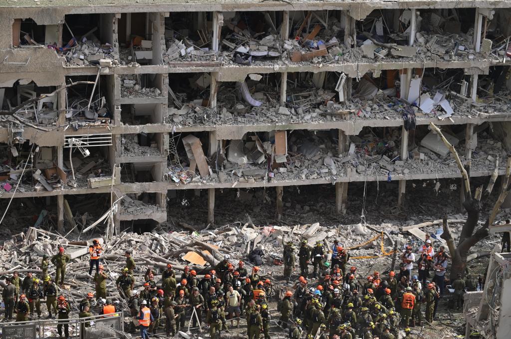 6月22日,在以色列中部特拉维夫的导弹袭击现场,应急和救援人员开展工作。新华社发(托默·诺伊贝格摄/基尼图片社)
