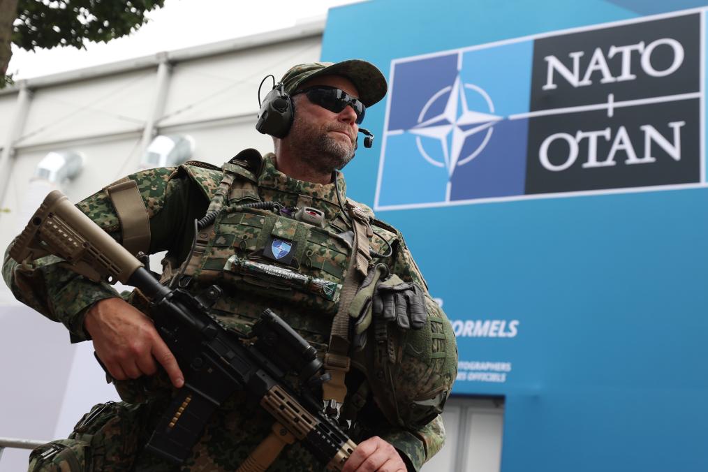 6月24日,在荷兰海牙,安保人员在北约峰会现场警戒。新华社记者赵丁喆摄