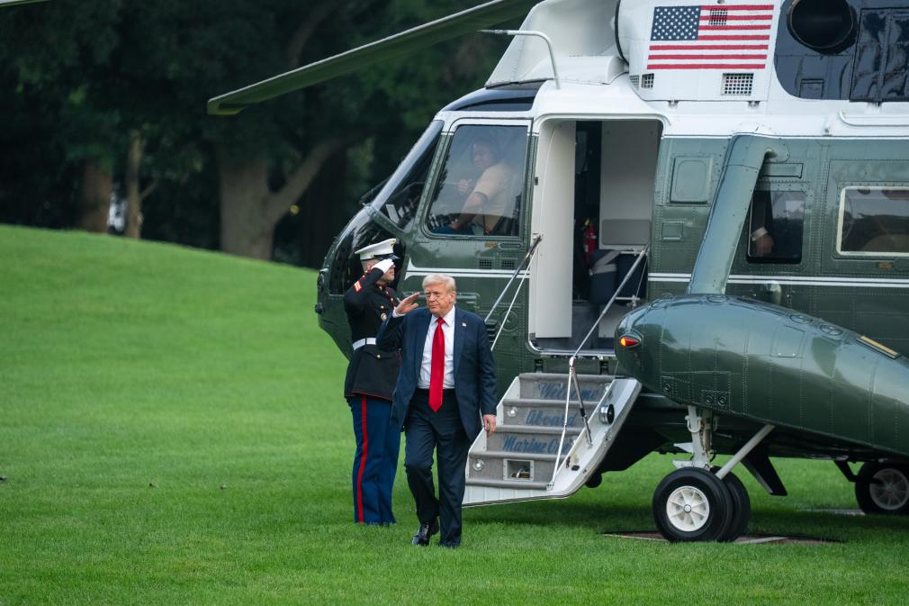 7月13日,美国总统特朗普乘直升机返抵华盛顿白宫。新华社记者胡友松摄