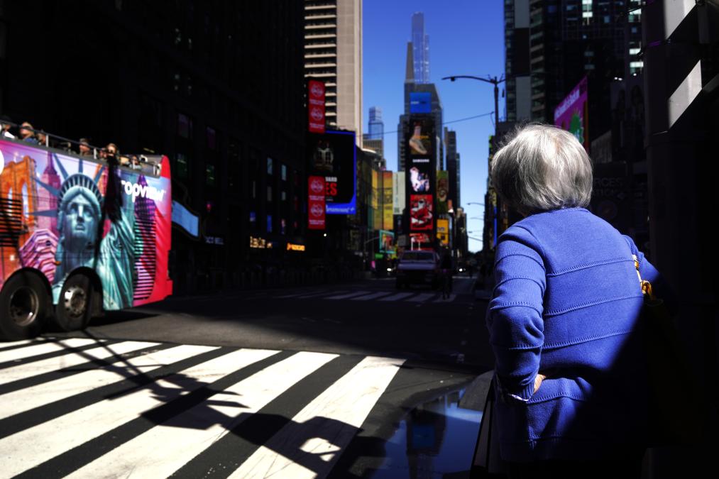 10月1日,在美国纽约曼哈顿的时报广场附近,行人等待通过人行横道斑马线过马路。新华社记者 吴晓凌 摄