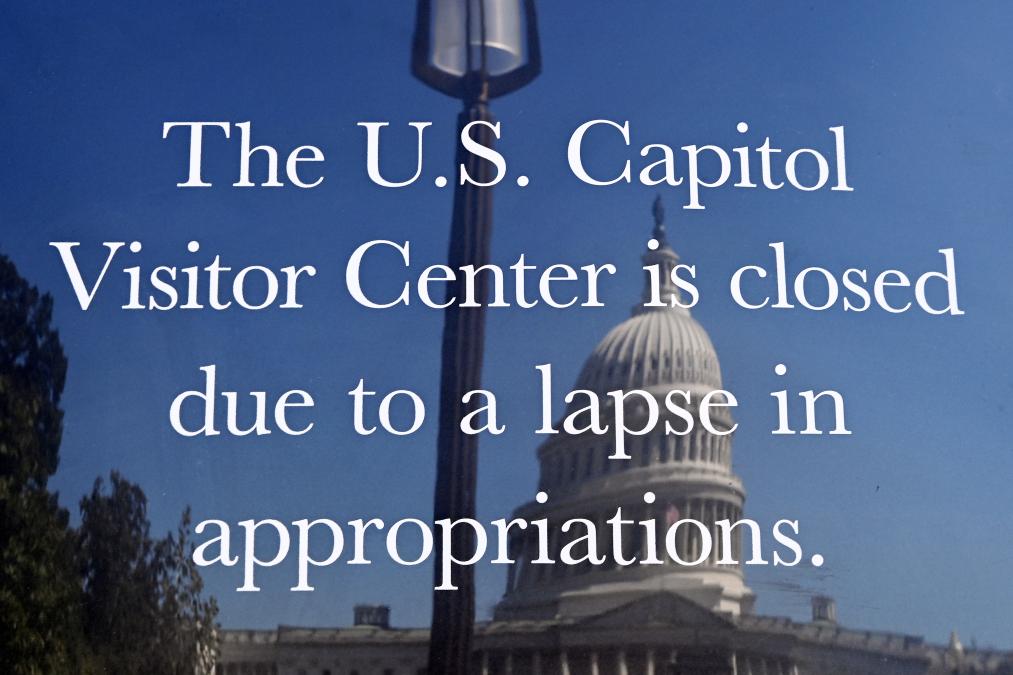 10月1日,在美国华盛顿的美国国会大厦前,公告牌显示国会大厦游客中心关闭。新华社记者 李睿 摄