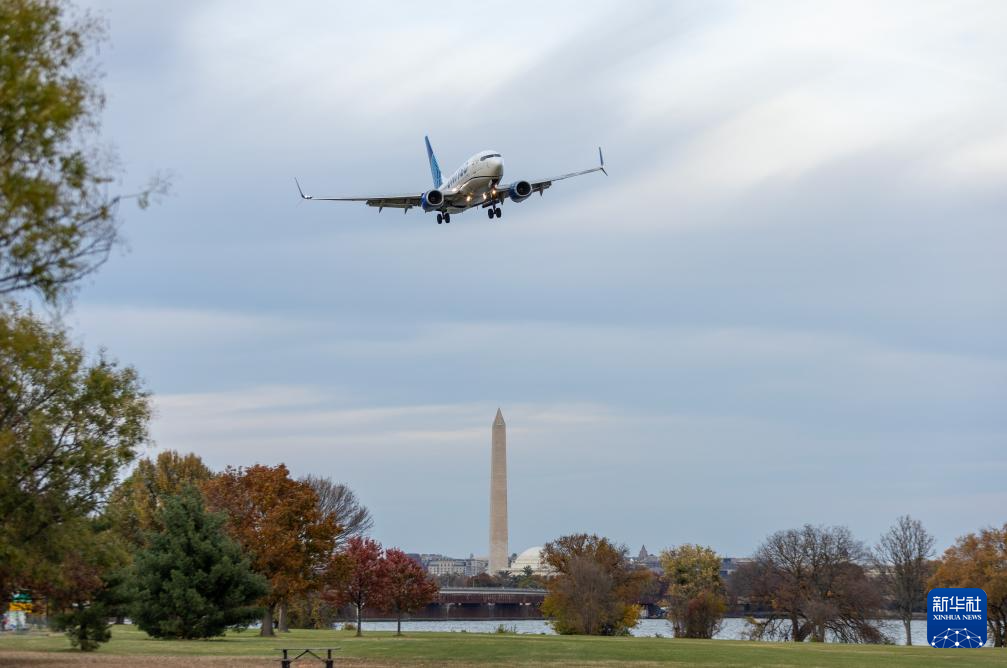 11月7日,一架美国联合航空公司飞机准备降落在美国弗吉尼亚州阿灵顿的里根国家机场。新华社记者 胡友松 摄