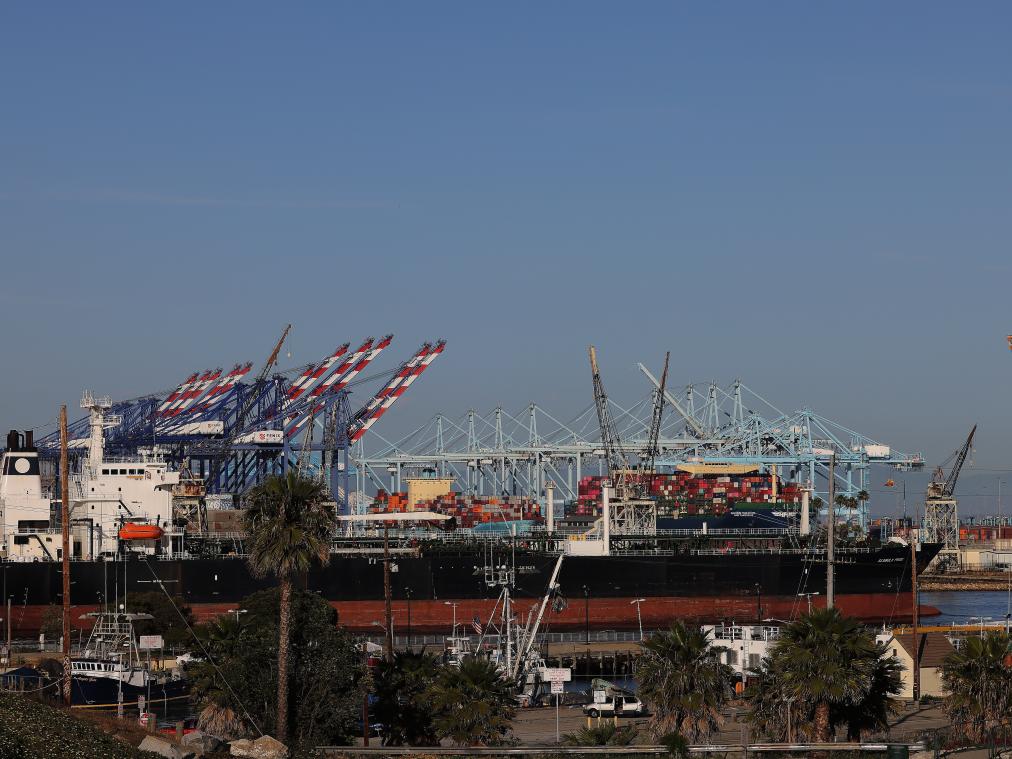 这是5月10日在美国洛杉矶港拍摄的货船。新华社发邱晨摄