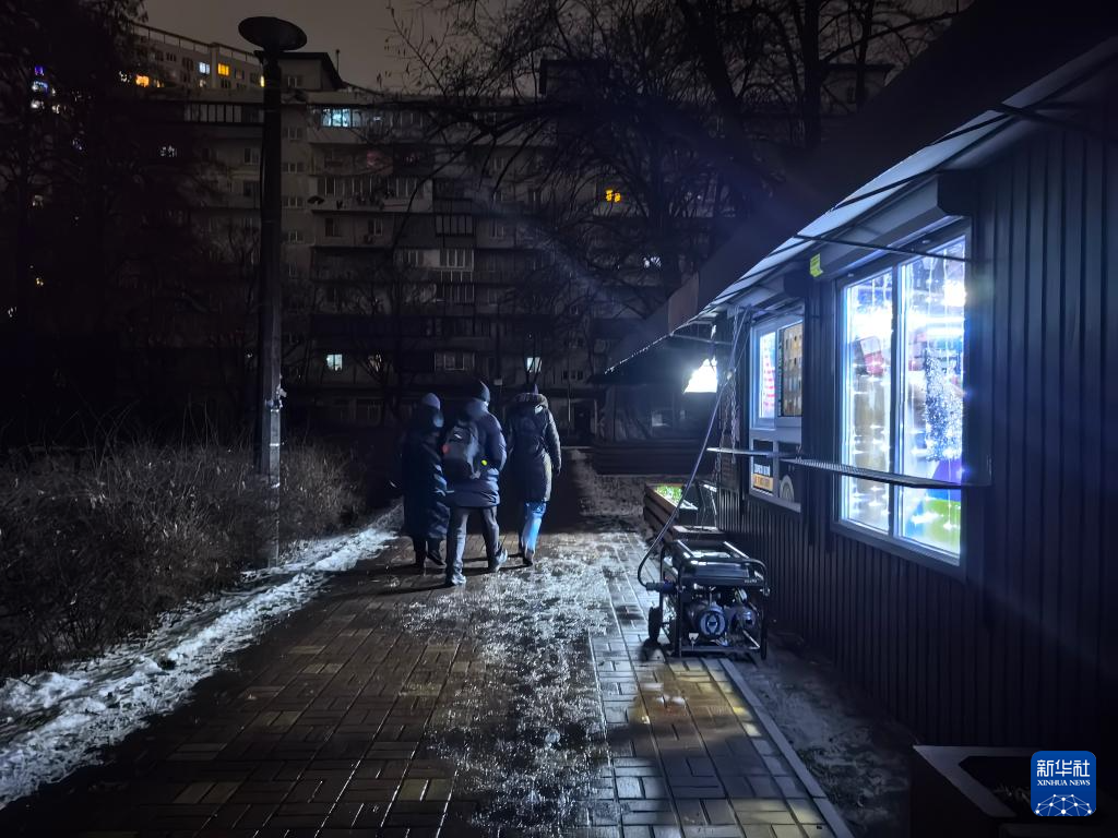 12月27日,在乌克兰基辅市第聂伯区,人们走过一处使用发电机照明的咖啡店。新华社记者 李东旭 摄