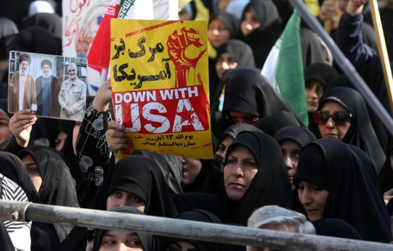 2025年11月4日,民众手持反美标语在伊朗首都德黑兰参加反美反以集会。新华社发