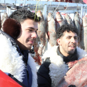 1月24日,在2026第十一届沈阳卧龙湖冬捕季活动现场,两名外国游客与捕捞到的大鱼合影。