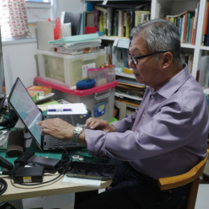 2025年8月23日,新加坡学者林少彬在位于新加坡的家中查看资料。(舒畅 摄)