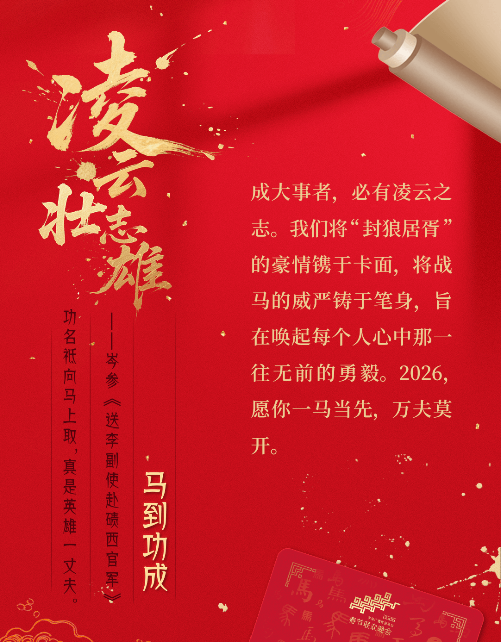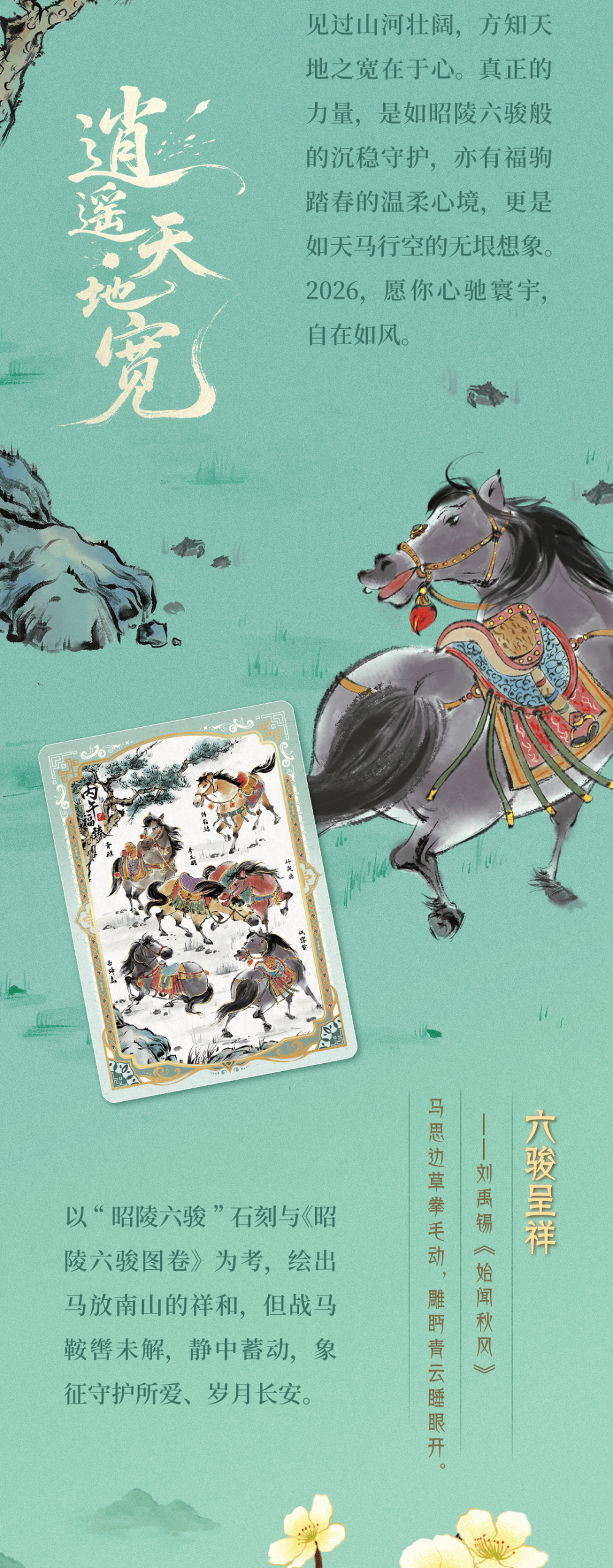 而这背后,是一代年轻人用自己的方式深入了解和传承传统文化。第三方数据机构报告显示,2025年总台春晚年轻用户参与度创新高,90后、00后占比66%,越来越多的年轻人成为主力观众。据报道,2026年,总台春晚首次向B站UP主敞开策划讨论的大门,邀请平均年龄不超过30岁的内容创作者参与共创。而“骐骥驰骋典藏卡”的创作团队,是曾推出《卡游三国》《长安三万里》《哪吒2》等卡牌产品的“Z世代”年轻画师们,他们的“创作动力源于不想让四大名著仅止于书本,不想让敦煌只在博物馆里,不想让昭陵六骏只刻于石上”。于是,今年这群年轻人把“春风得意马蹄疾”凝于卡面,把敦煌壁画白马带出莫高窟——就是为了让千年之美,能被握在手心。