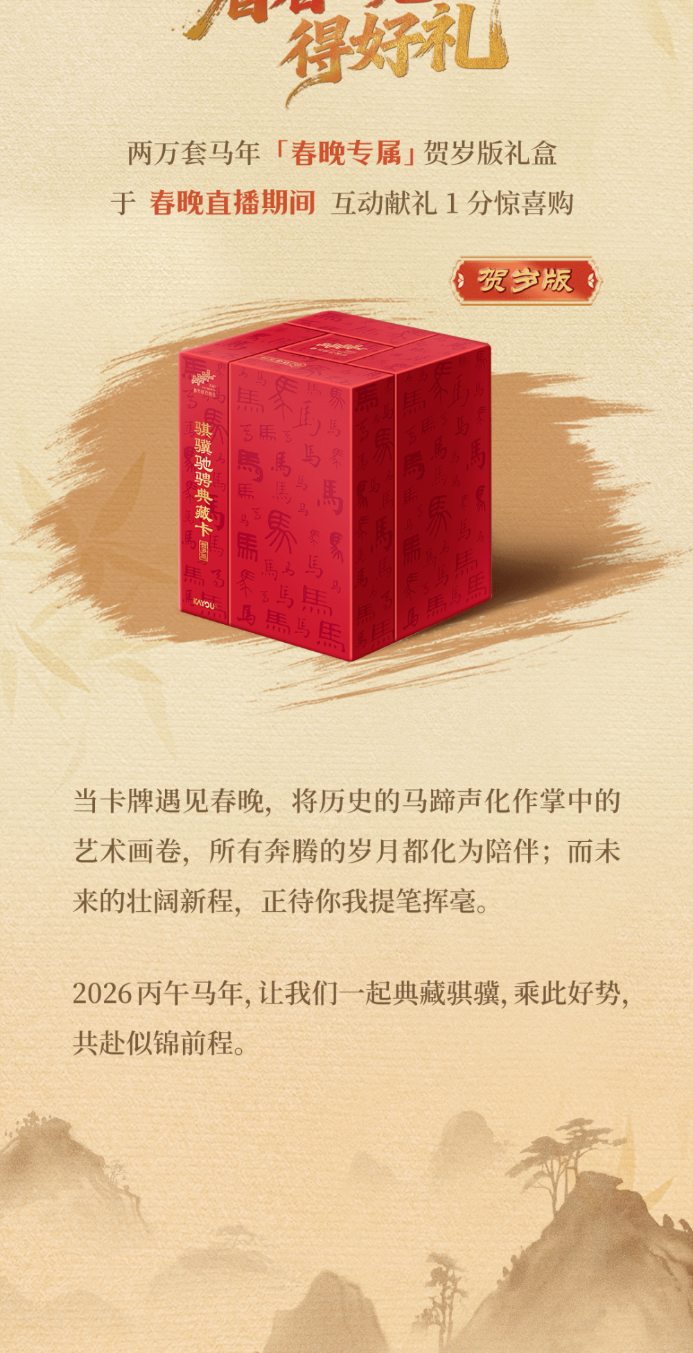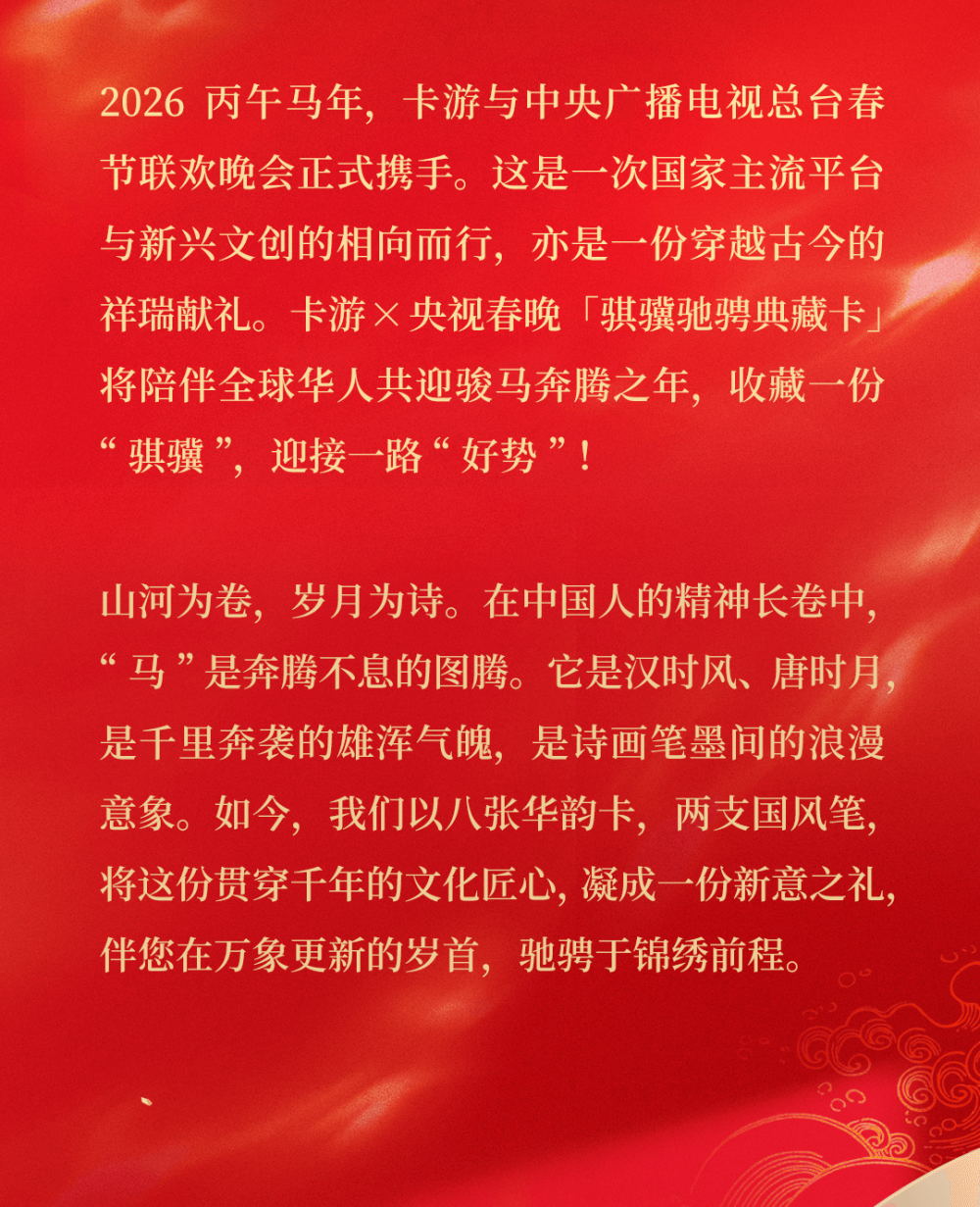 今年一大亮点,当数“骐骥驰骋典藏卡”对年轻人的新邀约。2月5日,中央广播电视总台正式官宣卡游成为2026年春节联欢晚会独家卡牌合作伙伴。这是春晚自创办以来首次设立该合作类别,标志着国家级文化盛典与新时代文创力量的深度联合,也意味着卡牌文创行业从特色文创赛道迈入主流文化消费视野。