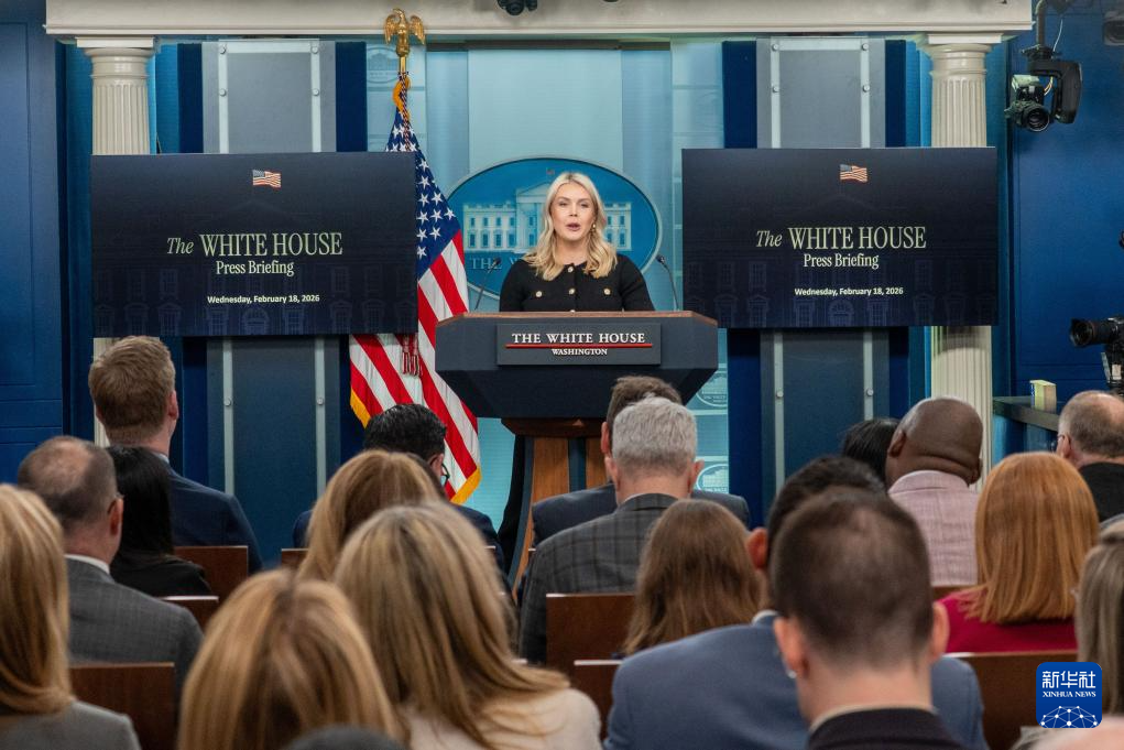 2月18日,在美国首都华盛顿,白宫新闻秘书莱维特出席记者会。新华社发(李源清摄)