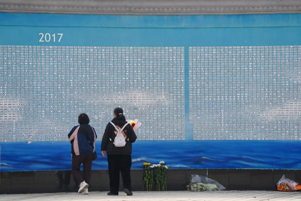 在长青生命纪念园的巨型蓝色海葬纪念墙上,写满了北京市1994年至2019年的骨灰海葬逝者名单,2020年之后的逝者姓名则通过位于纪念广场旁的“电子墓碑”展示,方便亲属祭奠。多年担任骨灰海葬活动主持人的宋朝舫告诉记者,在今年的京津冀骨灰海葬启航活动中,主办方会为家属提供鲜花花瓣与水溶性祭扫卡寄托哀思。