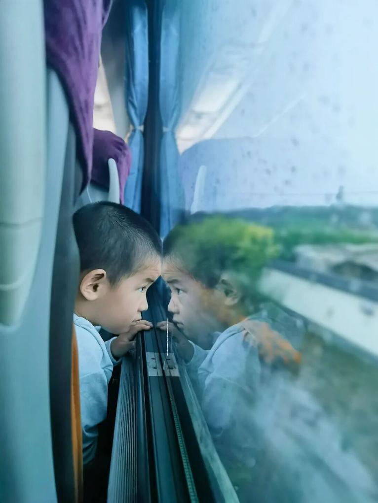 回家的客车上,儿子橡果被窗外连绵不绝、不断向后的景致所吸引,头顶着车窗,巴巴儿地朝外望。后座上的我觉得很有趣,便用手机记录了下来。@鄭
