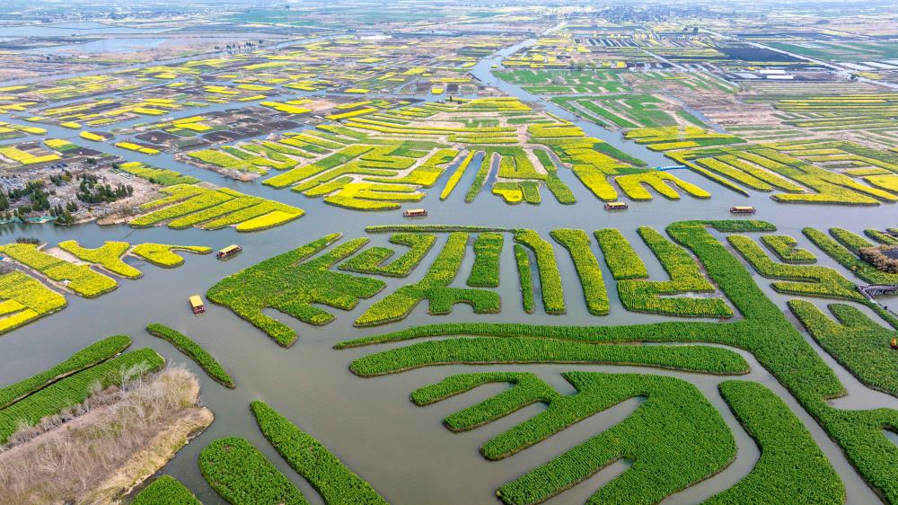 3月19日,游客乘船在江苏省兴化市千垛景区赏花游玩(无人机照片)。当黛色群峰披上鹅黄嫩绿的轻纱,当无垠原野晕开斑斓绚丽的油彩,春便浩浩荡荡地来了。春满山河,人间正暖。新华社发(顾继红 摄)