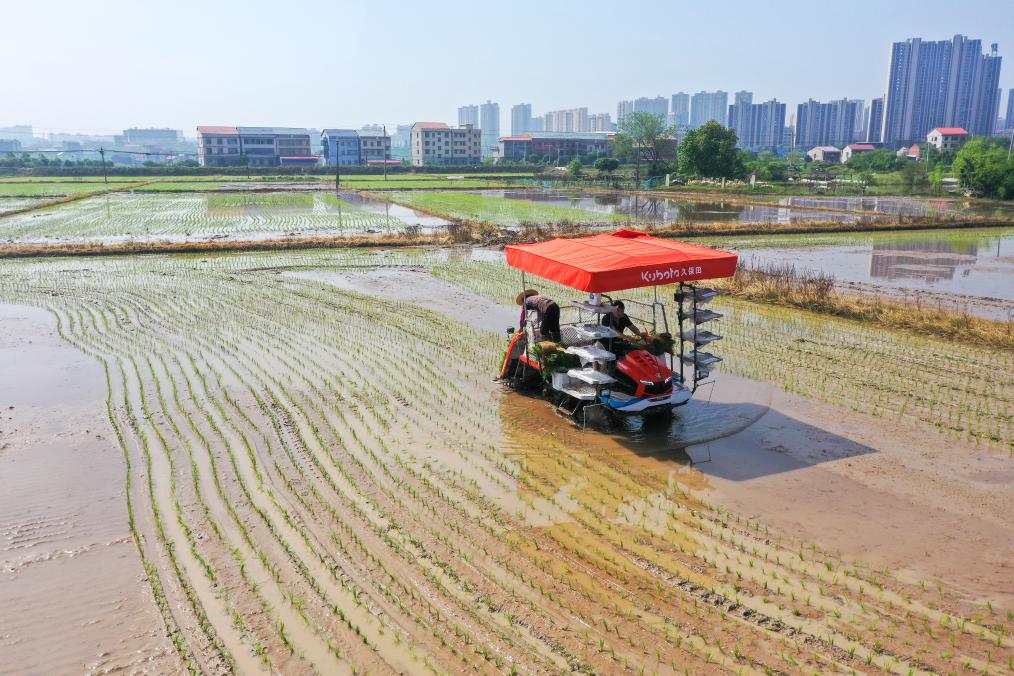 4月19日,在湖南省衡阳市衡阳县西渡镇梅花村,农民驾驶插秧机在进行水稻插秧作业(无人机照片)。谷雨节气到来之际,各地农耕劳作一派繁忙。新华社发(刘欣荣摄)