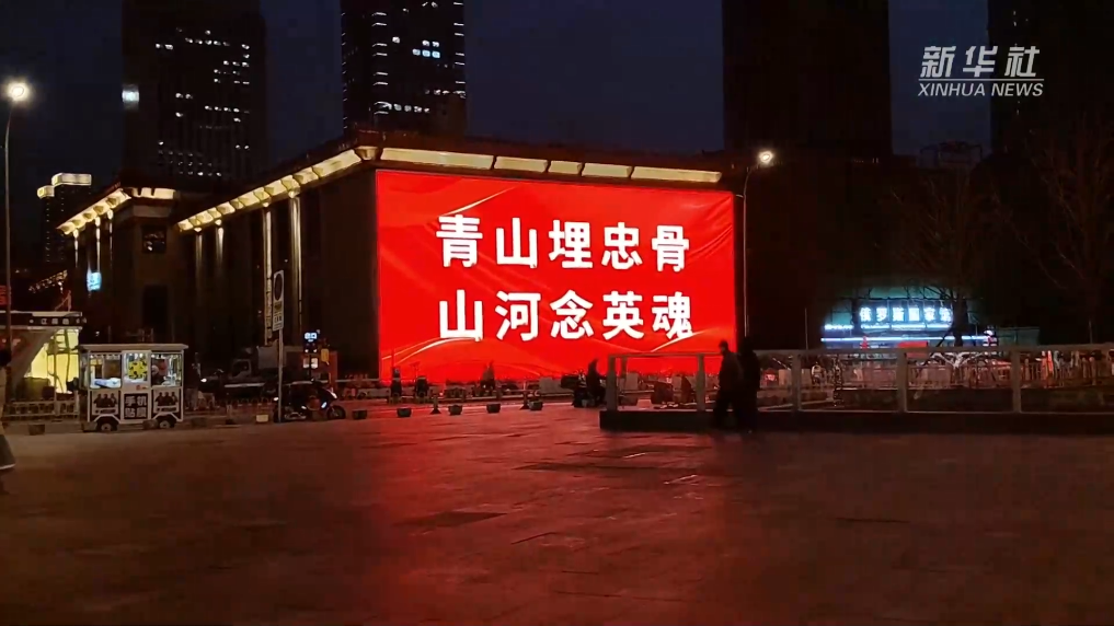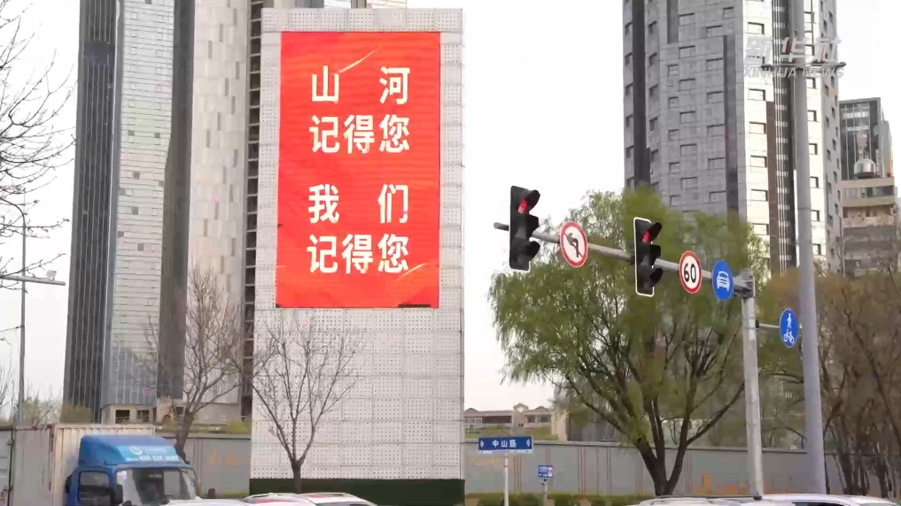 4月20日,在沈阳市青年大街两侧整齐悬挂国旗,红色元素遍布街巷,多处户外大屏同步点亮,循环播放致敬英雄的画面。
