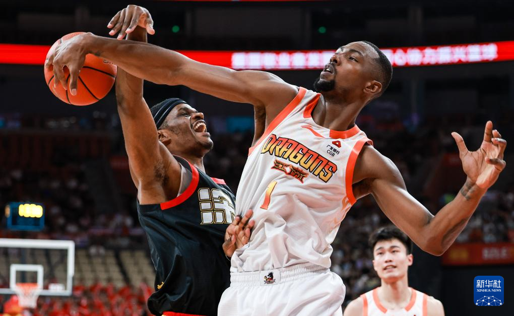 4月11日,江苏肯帝亚队球员贾尔斯(右)在比赛中防守深圳马可波罗队球员阿立兹。