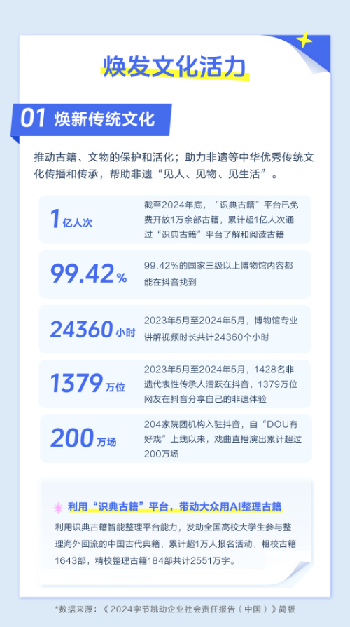 数字化技术让传统文化的推广和沉淀变得更加便捷。2022年,字节跳动与北京大学合作打造“识典古籍”平台,利用AI技术推动古籍数字化,并将平台资源向全社会免费开放。截至2024年底,“识典古籍”已免费开放1万余部古籍,服务超1亿人次。短视频和直播则为传统文化的挖掘和再创作提供了新工具和新思路。数据显示,2023年5月至2024年5月,1428名非遗代表性传承人活跃在抖音,1379万位网友在抖音分享自己的非遗体验。