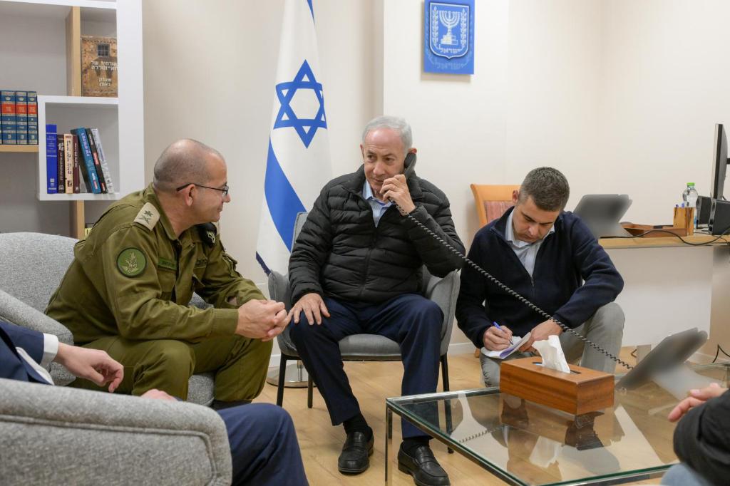 这是以色列总理办公室3月17日在社交媒体上发布的以总理内塔尼亚胡(中)与军方人士一起打电话的图片。新华社发