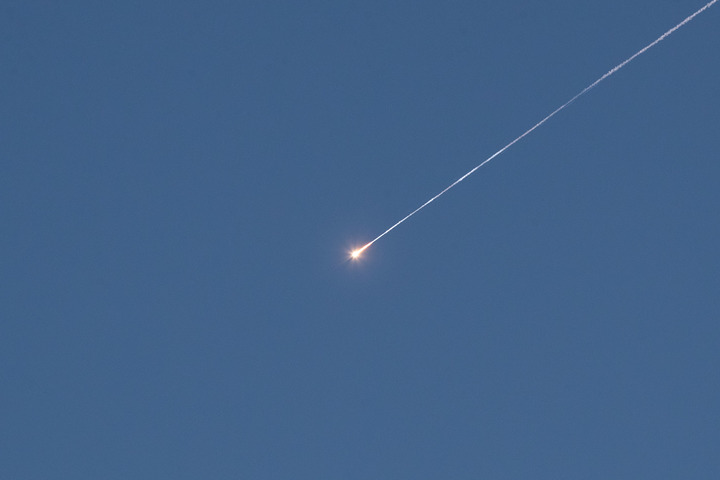 3月17日,在耶路撒冷上空,以军防空拦截弹击中导弹,导弹碎片落下。新华社记者陈君清摄