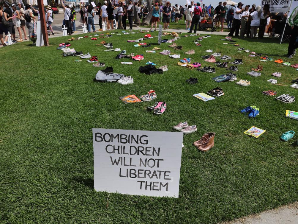 这是3月28日在美国加利福尼亚州长滩市拍摄的参加“不要国王”抗议活动的人们摆放的反战标语等物品。新华社发(邱晨摄)